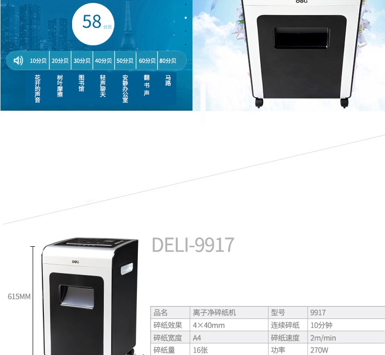 得力(deli)9917 4级保密专业销毁碎纸机 (单次16张 31L 持续10分钟 可碎卡碎光盘)