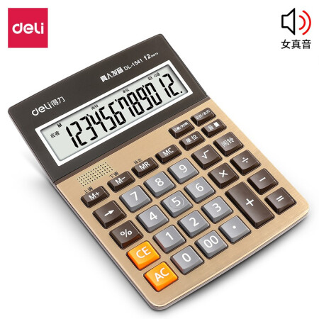 得力 deli 12位大屏幕语音计算器 闹钟日历功能语音计算机 办公用品 金色1541A